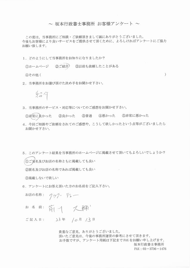 風俗営業を専門に扱っている行政書士事務所ということだったので安心して許可申請をお任せできると思ったからです。